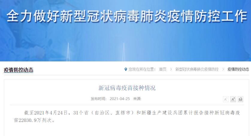 截至2021年4月24日,31个省(自治区、直辖市)和新疆生产建设兵团累计报告接种新冠病毒疫苗22030.9万剂次。