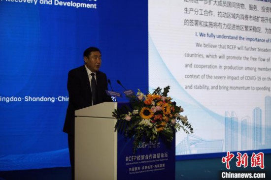 据悉,RCEP经贸合作高层论坛由中国国际商会和青岛市人民政府主办,以“共促复苏、共享机遇、共谋发展”为主题,会采用线上和线下相结合的形式,吸引了RCEP各国有关政府部门官员、贸易投资促进机构和商协会代表、驻华使节、经贸领域科研院所专家学者以及企业代表与会。 (记者 胡耀杰)