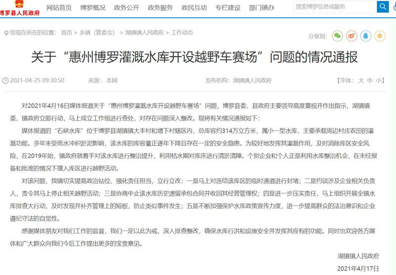 通报称,对2021年4月16日媒体报道关于“惠州博罗灌溉水库开设越野车赛场”问题,博罗县委、县政府主要领导高度重视并作出指示,湖镇镇委、镇政府立即行动,马上成立工作组进行查处,对存在问题深入整改。