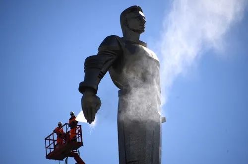 2018年4月14日,在俄罗斯莫斯科市,市政工作人员正在对位于列宁大街的尤里·阿列克谢耶维奇·加加林的雕像进行例行保洁清理工作。新华社/卫星社