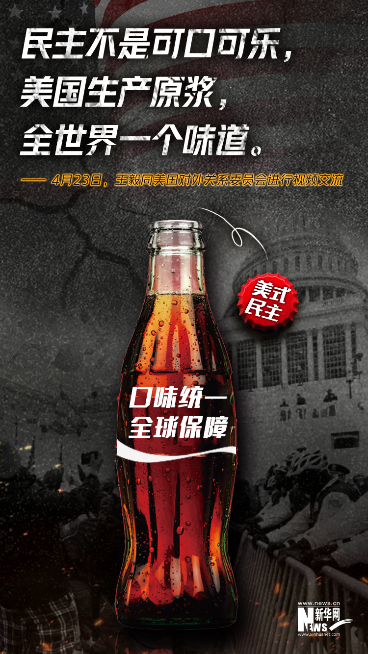 4月23日晚,国务委员兼外长王毅在北京同美国对外关系委员会进行视频交流。王毅表示,最近有种论调,将中美之争渲染为“民主和威权”之争,以意识形态划线,将世界各国标签化。但民主不是可口可乐,美国生产原浆,全世界一个味道。如果地球上只有一种模式、一种文明,这个世界就会失去了生机,没有了活力。