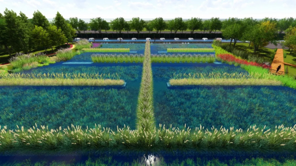 湿地计划建设生物稳定塘,与景观喷泉、台地花园和人文广场相结合,既能给参观者直观感受污水厂尾水经过一系列净化后的效果,也给参观者提供一个休闲交流的场所。