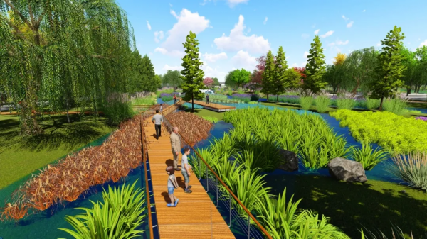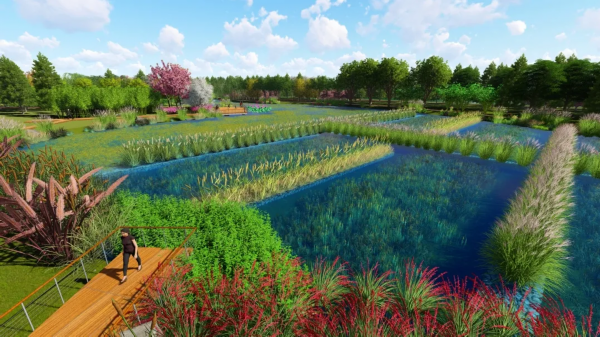 湿地计划种植香樟、广玉兰、女贞、等高大乔木,以及莲类、荷类、菖蒲等多种水生花草,打造错落有致的整体效果。