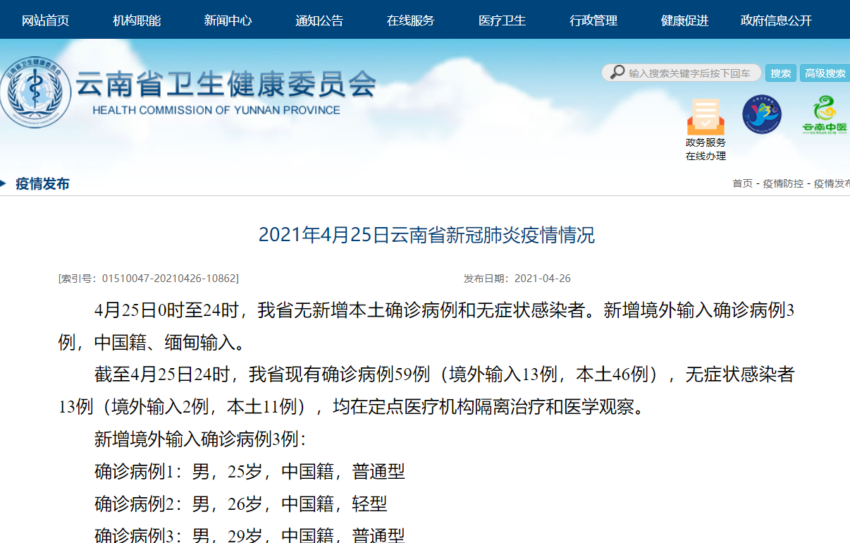 荔枝新闻讯 据云南省卫健委官网发布的消息,4月25日0时至24时,云南省无新增本土确诊病例和无症状感染者。新增境外输入确诊病例3例,中国籍、缅甸输入。
