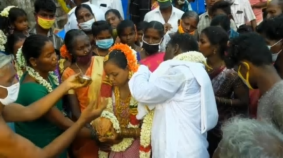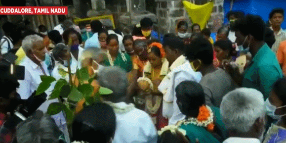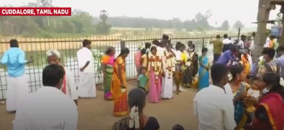 随着印度疫情恶化,泰米尔纳德邦政府24日宣布,从26日起关闭电影院、礼拜场所、商场、酒吧和美容院。这让几对已经计划好几天后在寺庙结婚的夫妇感到震惊。由于禁止进入礼拜场所,这几对夫妇竟在一座神庙的入口处举行婚礼。根据现场视频显示,到场参加婚礼的亲友们大多数都没有佩戴口罩,也没有保持社交距离,明显违反了防疫规定。