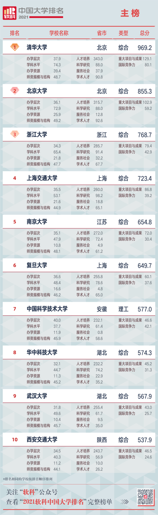 2021软科中国大学排名(主榜)的上榜高校共有582所,清华大学、北京大学、浙江大学占据前三,上海交通大学、南京大学位列全国前五。其他位列全国前十名的大学依次为复旦大学(第六)、中国科学技术大学(第七)、华中科技大学(第八)、武汉大学第(九)、西安交通大学(第十)。