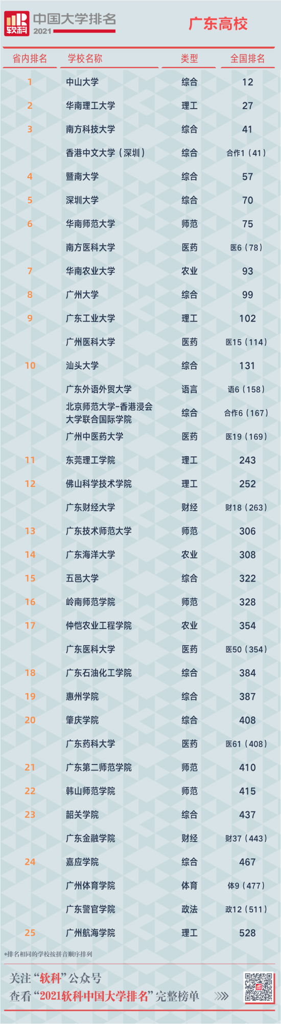 南方+第一时间获悉,广东高校表现不俗,共有8所广东高校跻身综合性大学排名百强。中山大学位列第12名,华南理工大学排名第27,南方科技大学排名第41,领跑广东高校建设。暨南大学第57名、深圳大学第70名、华南师范大学第75名、华南农业大学93名、广州大学第99名。