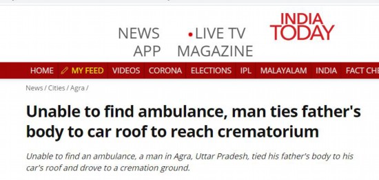 印度疫情防控几乎“失守”之际,《今日印度》26日报道了这样一则新闻:因找不到救护车,印度一男子不得已将父亲尸体绑在车顶,自己驾车将其送往火葬场。