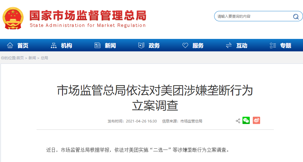 近日,市场监管总局根据举报,依法对美团实施“二选一”等涉嫌垄断行为立案调查。