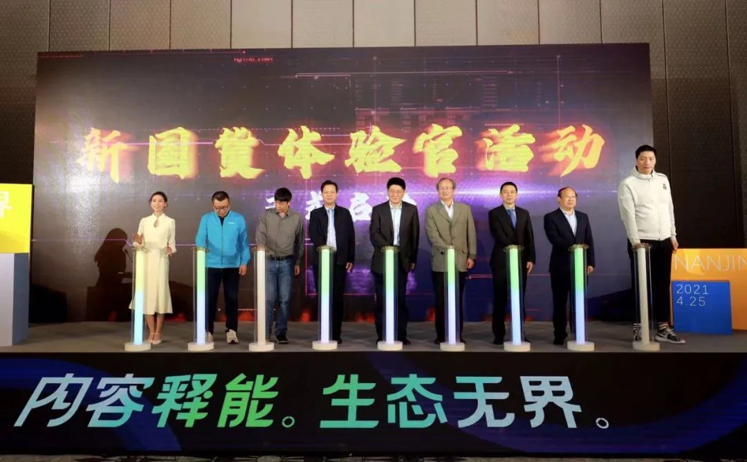 “新国货体验官”启动仪式上,江苏省市场监督管理局副局长、党组成员李杰、江苏有线党委委员、副总经理吴国良、江苏省粮食集团有限责任公司副总经理、党委委员徐兴起、江苏汇鸿国际集团中嘉发展有限公司董事长谢榴丹、杭州乐秀电子科技有限公司CEO喻金明、江苏高淳陶瓷股份有限公司副总经理王贵夫、天津须眉科技有限公司创始人兼CEO陈兴荣、江苏同曦篮球俱乐部副总经理、中国著名篮球大中锋唐正东、全网千万粉丝生活博主蒋小喵一起摁下了启动键,与参会嘉宾和内容创作者们共同期待下一个“国货之光”的诞生。