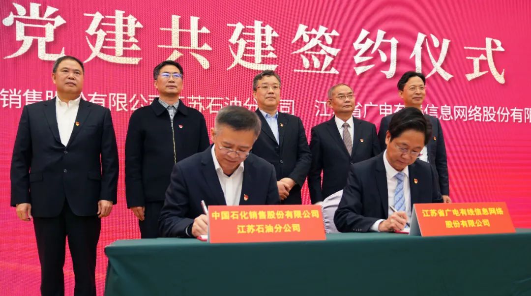 活动中,中国石化江苏石油分公司与江苏有线举行了党建共建签约仪式。在省委省级机关工委常务副书记李新平,省委党史工办二级巡视员赵民强,中国石化江苏石油分公司党委书记、董事长张有根,中国石化江苏石油分公司党委副书记、总经理杨文化,江苏有线党委副书记、总经理庄传伟的见证下,中国石化江苏石油分公司党委副书记、纪委书记、工会主席王闽和江苏有线党委副书记黄秉生代表双方签署了党建共建协议。