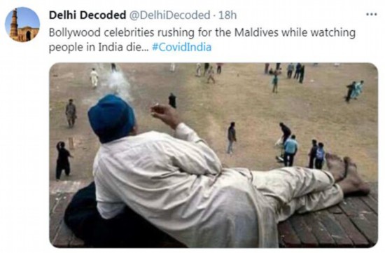 有网友写道:“眼睁睁看着印度人死去,宝莱坞的名人们赶往马尔代夫……”↓