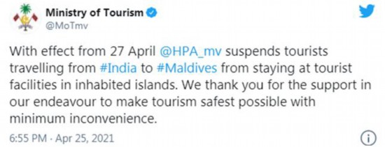 当地时间4月25日,马尔代夫旅游部发推称:“从4月27日起,马尔代夫卫生机构禁止从印度到马尔代夫的游客在有人居住的岛屿的旅游设施内停留。我们感谢您对我们的支持,最大限度地减少不便,使旅游变得尽可能安全。”