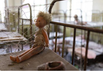 2019年11月12日,在乌克兰北部的切尔诺贝利核电站隔离区,一个洋娃娃被摆放在废弃的幼儿园内。