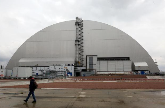 当地时间2021年4月15日,乌克兰切尔诺贝利,一名男子走过被盖住的切尔诺贝利核电站反应堆。
