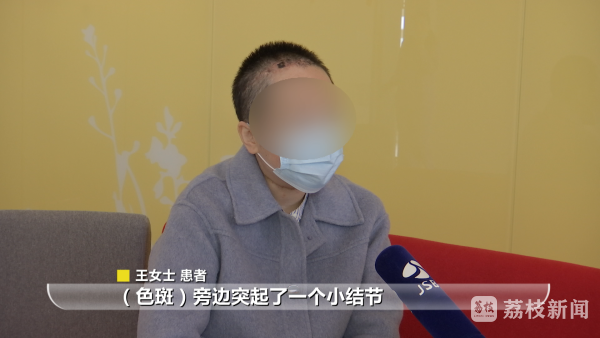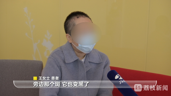 王女士告诉记者,三年前的时候,这片头皮集中长白头发,旁边会有一小片色斑,“一直到今年,色斑旁边突起了一个小结节,就觉得不太对劲儿了,旁边那个斑,它也变黑了。”