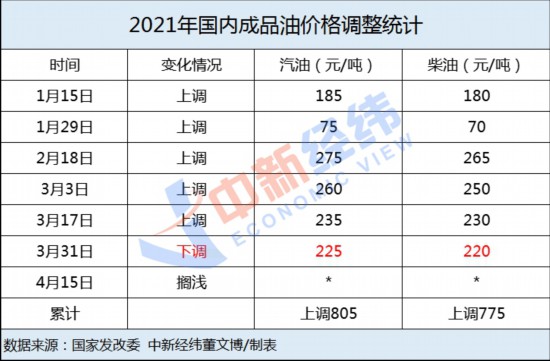 据中新经纬客户端梳理,截至目前,年内成品油调价已经历七轮,呈现“五涨一跌一搁浅”的格局,汽油总计上调805元/吨,柴油总计上调775元/吨。本轮上调是大概率事件,调价过后,2021年国内成品油调价格局将呈“六涨一跌一搁浅”。