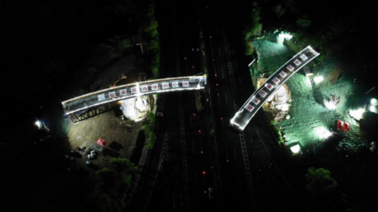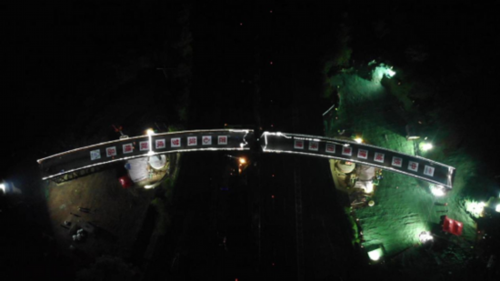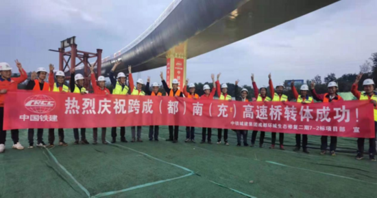 成(都)南(充)高速是目前四川省运输最繁忙的干线之一,平均每分钟就有50余辆汽车飞驰而过。4月 27日零时三十分,由中铁城建集团承建的成都市环城生态修复工程——跨成南高速公路大跨度双幅双曲钢箱梁转体桥顺利完成同步牵引转体。此次转体历时120分钟,两座桥梁完美完成了高难度“空中体操”,成功实现零误差转体对接。