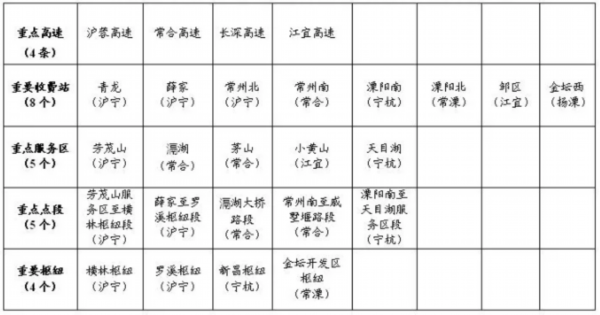 通过对全市29个收费站在以往大流量期间进出口流量研判分析以及受江阴大桥分流过来的货车流量预测,沪蓉高速、常合高速、江宜高速是我市五一期间重点大流量高速路段。同时,常州高速公路交通大流量主要分布在4条高速、8个收费站、5个服务区、5个重点路段和4个主要枢纽这些位置,如下图: