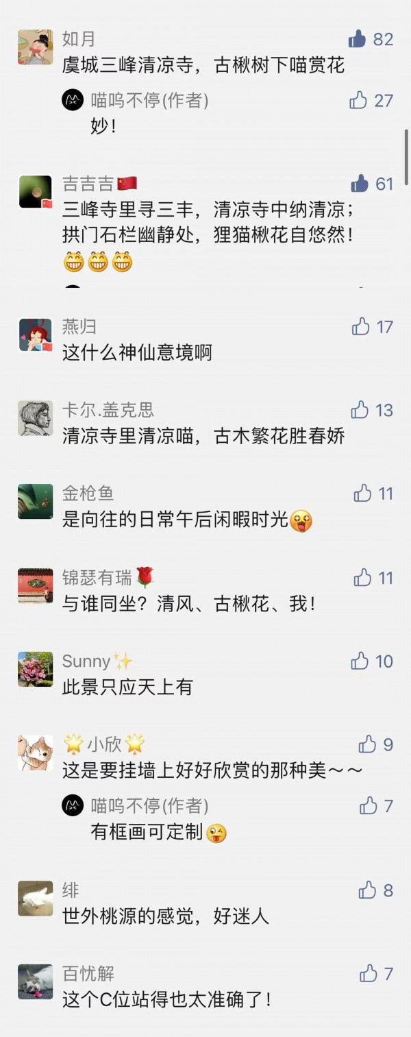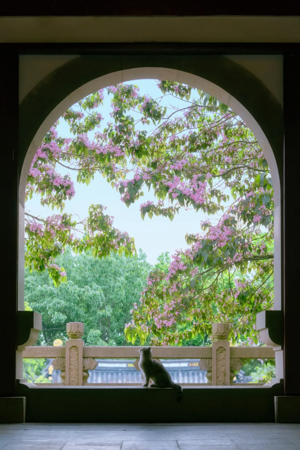 26日中午,一张照片让三峰古楸“成功出圈”——拱门中,紫色花影下,猫咪独坐门槛抬头仰望。