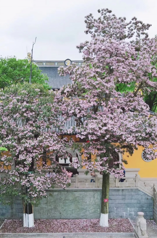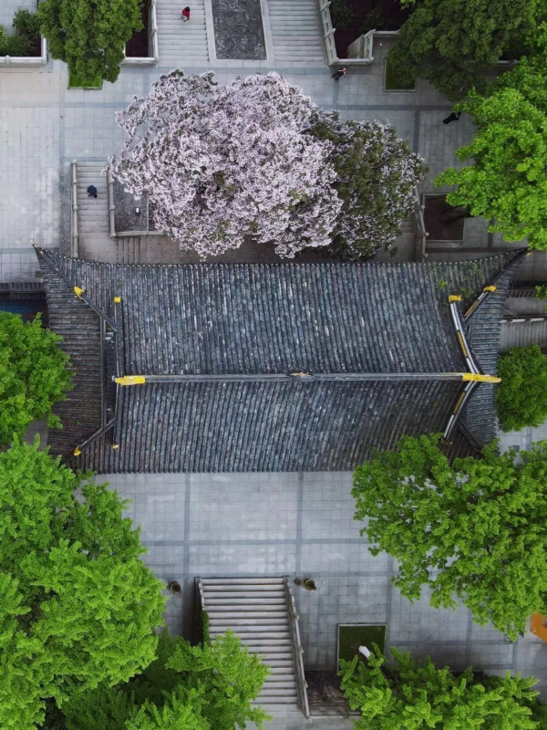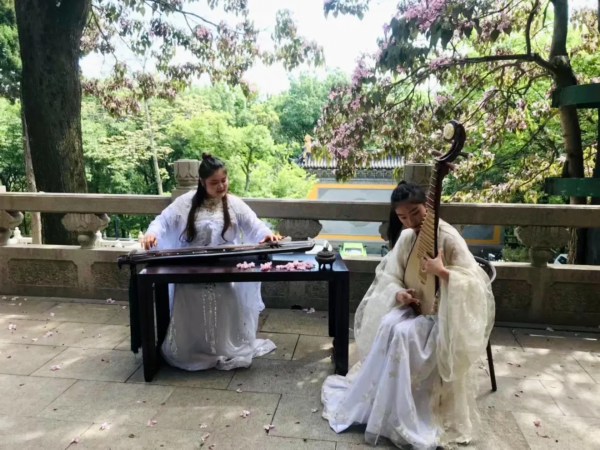 有人举着长枪、短炮、操作着无人机,也有人穿着汉服、抱着琵琶、扶着古琴,配合着这楸树花开的意境。