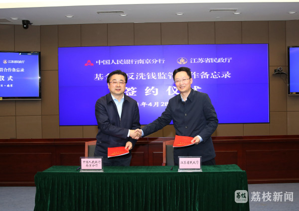 今天(4月28)下午,江苏省民政厅与中国人民银行南京分行签署基金会反洗钱联合监管合作备忘录,正式开启对全省基金会反洗钱监管的合作。