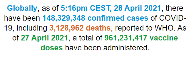 根据世卫组织最新实时统计数据,截至欧洲中部夏令时间4月28日17时16分(北京时间4月28日23时16分),全球累计新冠肺炎确诊病例148329348例,累计死亡病例3128962例。28日全球新冠肺炎确诊病例新增763656例,死亡病例新增12260例。(总台记者 朱赫)