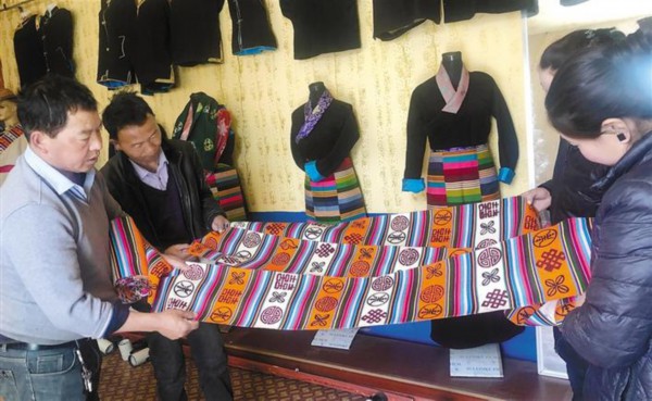 图为山南市扎囊县吉汝村藏毯制作厂的工作人员展示制作好的氆氇。