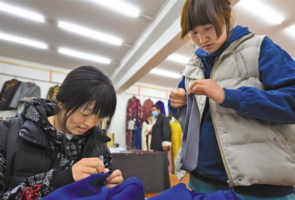 图为拉萨市娘热民族手工艺服饰厂的学徒在学习缝制民族服饰。