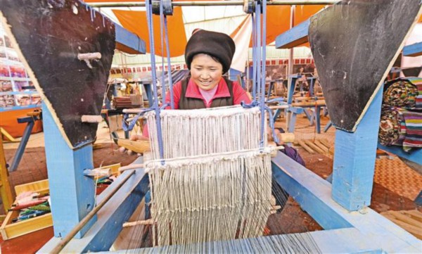 图为墨竹工卡县宗穆厦传统艺术品加工有限公司的员工在纺织车间制作氆氇。