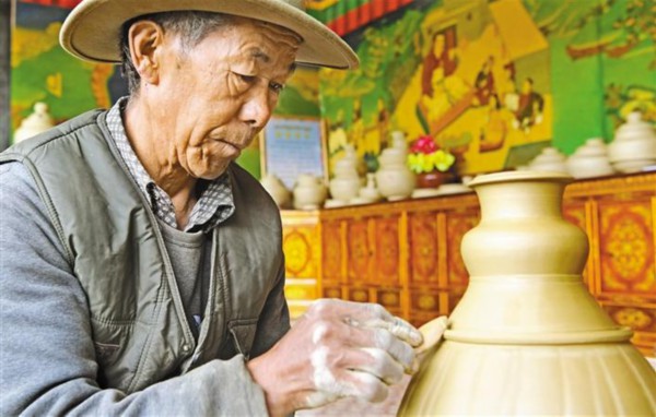 图为山南市扎囊县扎其乡的陶瓷匠人在制作陶器。
