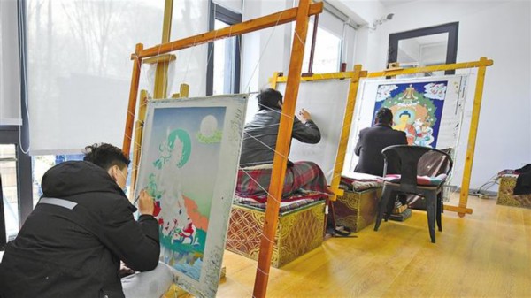 图为拉萨市八廓唐卡绘画中心的画师们在绘制唐卡。