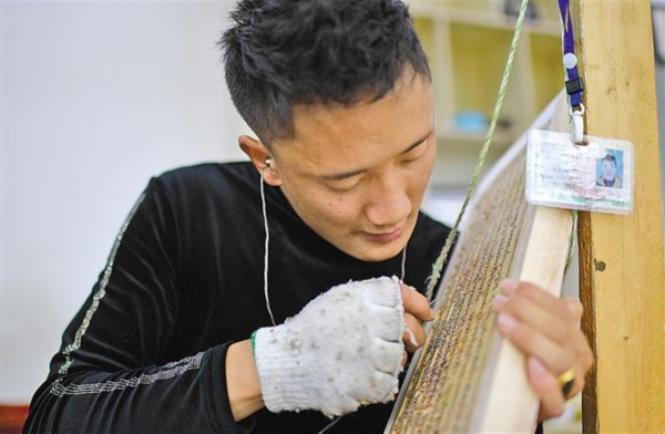 图为拉萨市城关区藏毯厂的员工在编制卡垫。