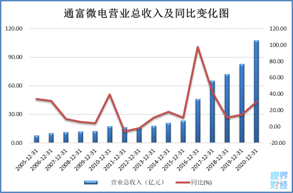 “2020年,是公司历史上极不平凡、实现重大转折的一年”,通富微电在2020年年报中这么说。从财务角度看,此非虚言。2020年,公司营业收入在连续8年实现增长后首次突破百亿达107.69亿元(详见下图),较上年同期增加30.27%,营收规模继续排名全球封测企业前列。此外,归属于上市公司股东的净利润、扣非净利润都是上市以来最高。