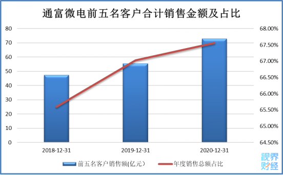 二是客户集中度高。通富微电前五名客户销售金额占比近3年始终保持在65%以上。2020年公司前五名客户合计销售金额72.75亿元,占年度销售总额比例67.56%。