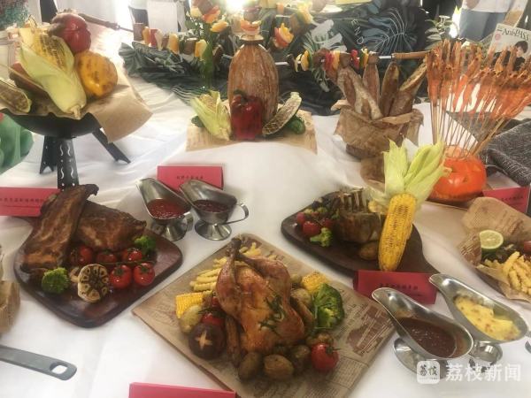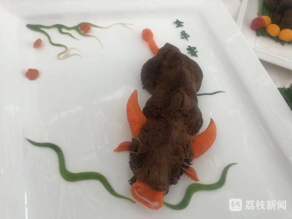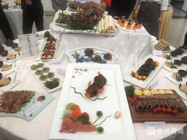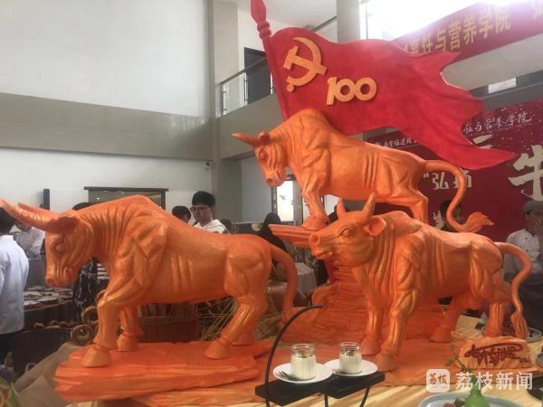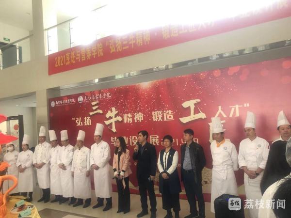 同一天,南京旅游职业学院烹饪与营养学院举办了2021届主题毕业设计展,以“弘扬三牛精神,锻造工匠人才”为主题,416名毕业生,30个小组,30个展位,上百道创意新颖的作品惊艳亮相。
