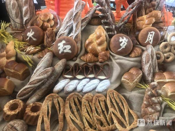 “火红岁月”展台,由20多款造型各异的面包组成,展台设计时加入麦穗等元素,象征着中国共产党带领全国人民走上了丰收、红火的日子。南旅院烹饪与营养学院教师吴兴树表示,“小麦又象征着丰收,没有共产党就没有我们现在丰收的年份。”