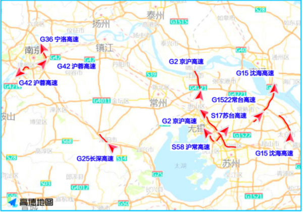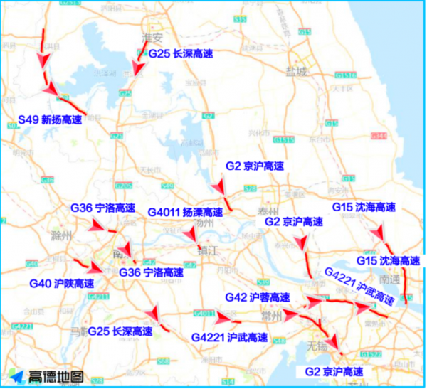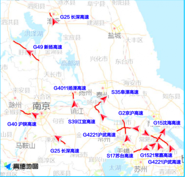 根据高德地图交通大数据预测 ,“五一”期间江苏省出程易拥堵缓行的高速主要是G15沈海高速、G1522常台高速、G42沪蓉高速等高速的部分路段;建议行驶到以下路段的车主时刻注意路况,及时躲避拥堵。
