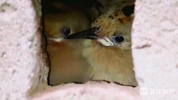 戴胜一家就住在南通博物苑东侧建筑的通风管里。一个月前,大伙儿又来到这里蹲守,果不其然,又有惊喜发现。陈超英告诉记者:“我们通过拍摄视频看到了五只小鸟,确确实实有五只,现在五只小鸟都长大了,今天上午10点01分左右,有一只小鸟长大单飞了。”