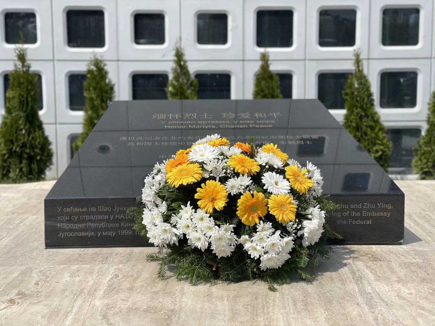 在纪念碑的右侧,竖立着一座由贝尔格莱德市政府于2009年5月7日建造的纪念碑,纪念碑上用中文和塞尔维亚文书写着:“谨此感谢中国在塞尔维亚最困难时刻给予的支持和友谊,并谨此缅怀罹难烈士”。
