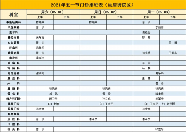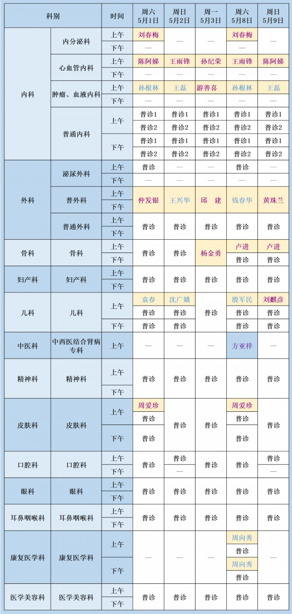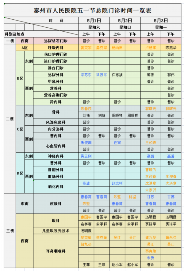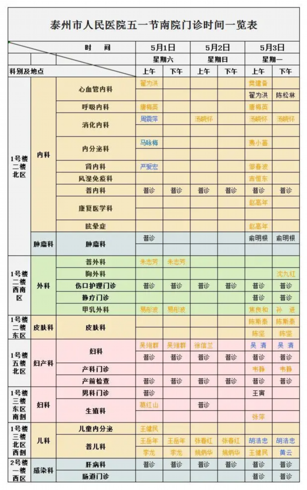 五一劳动节期间泰州市第四人民医院门诊工作具体安排如下↓↓↓