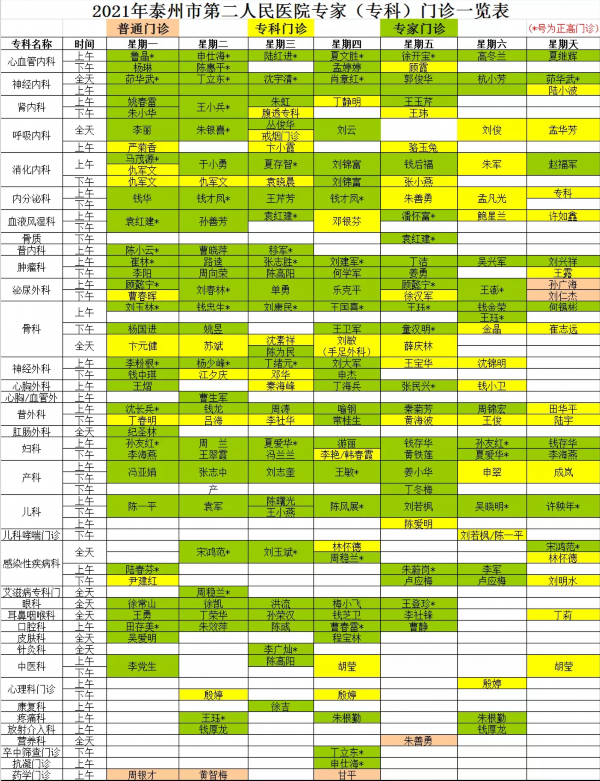 1、表格颜色表示门诊类型:淡蓝为专科专家门诊,绿色为专科门诊,黄色为专家门诊,无色为普通门诊;