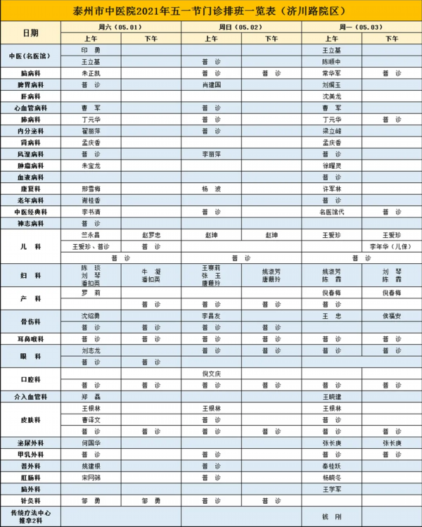 泰州市中医院五一期间正常开诊,各个专科都有专家坐诊。