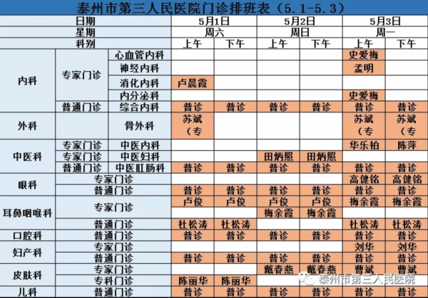 “五一”节期间泰州市第三人民医院急诊24小时接诊,门诊开诊安排见下表↓↓↓