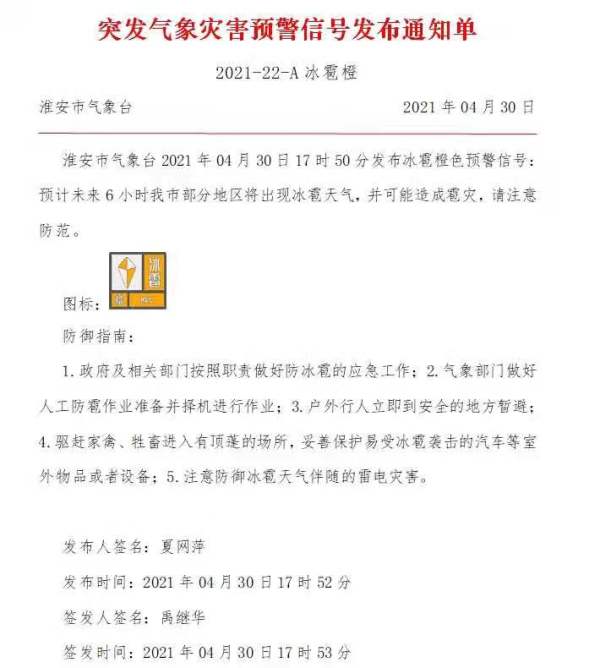 我苏网讯 4月30日晚上6点左右,淮安遭遇强对流天气。淮安市气象台于晚上6点50分发布天气实况称:“今天傍晚起我市中北部地区出现强对流天气,出现冰雹、12级雷雨大风等灾害性天气。预计未来2小时内我市市区、淮阴区、淮安区、涟水、洪泽、金湖等地仍将有冰雹、10级以上雷雨大风等灾害性天气,21时后将逐渐减弱。”