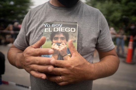 2020年11月25日,在阿根廷布宜诺斯艾利斯省蒂格雷,一名男子手捧马拉多纳的自传。(新华社发,马丁·萨巴拉摄)