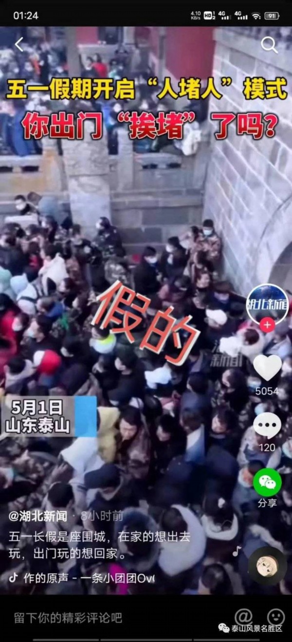 2021年5月1日,有部分新闻媒体、自媒体等,陆续发布了一些关于“五一”假期首日泰山景区“游客大量聚集”等视频、图片、文字、音频等。经技术甄别、现场勘验,均不是发生在今年五一假期,有些视频甚至是发生在几年前,严重干扰了游客的正常出行,诋毁了景区常态化疫情防控成果,均为不实报道。