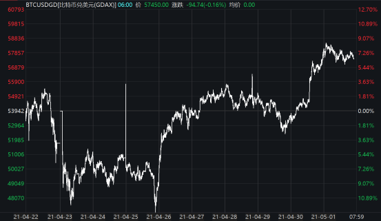截至5月2日6:00,比特币现价为57450美元/枚,2021年4月,比特币价格约下跌10%。