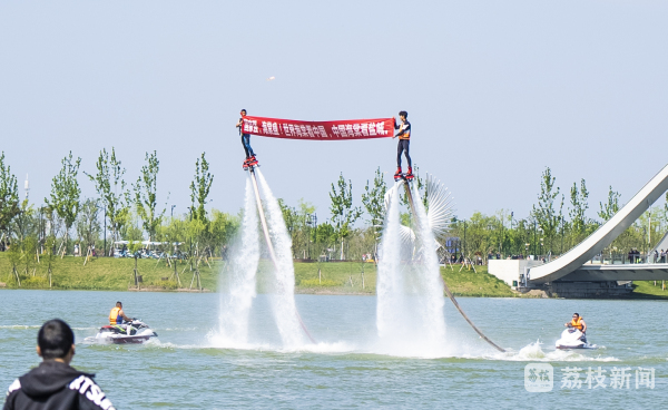 和风日暖,水天一色。在海棠园的湖面上,摩托艇、动力冲浪、水上飞人等表演不断上演。尤其是水上飞人表演,专业技术员时而一飞冲天,如蛟龙出水;进而旋转空翻,如空中飞燕,动作惊险刺激,吸来游客的阵阵惊呼和叫好声。