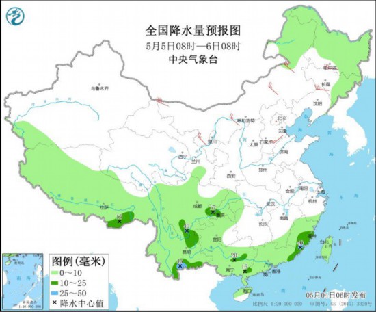 全国降水量预报图(5月5日08时-6日08时)